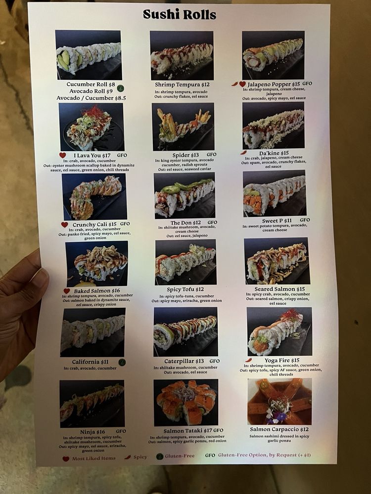 California roll, spicy tofu, Spam nigiri, salmon tataki nigiri, tuna nigiri, or seared salmon nigiri.